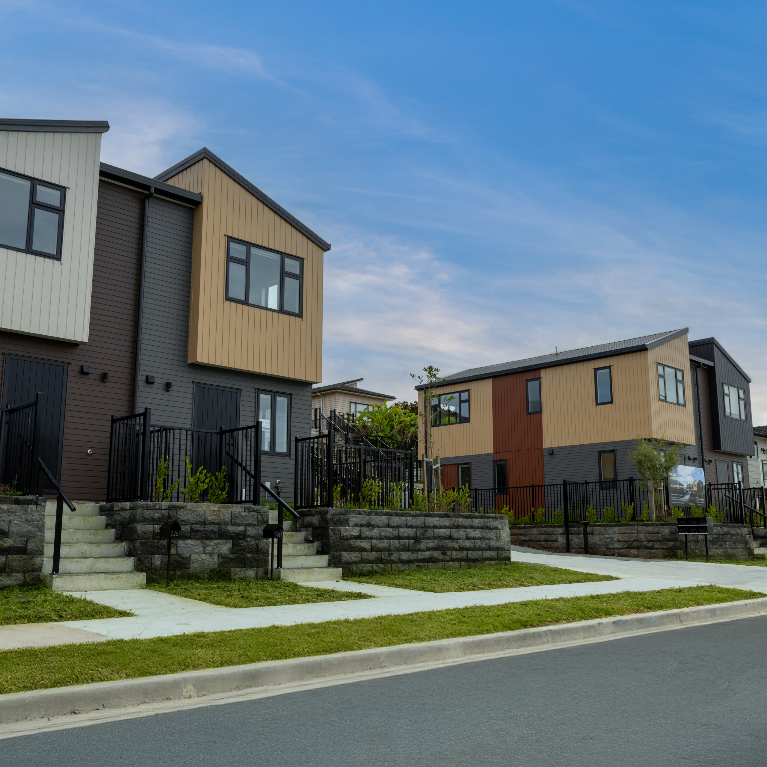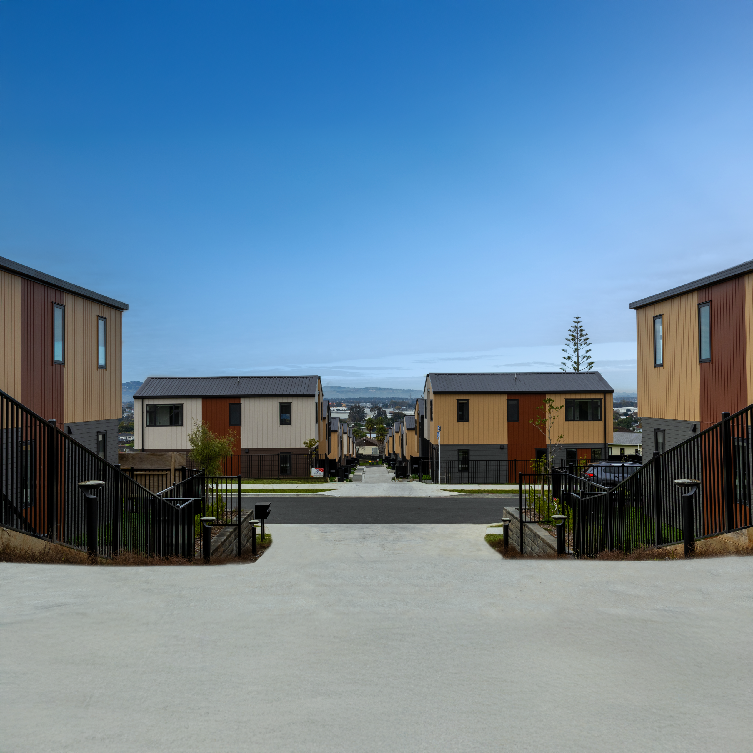 Located on an elevated site in South Auckland, the Alfriston development comprises a collection of thoughtfully designed duplex homes positioned to take advantage of the surrounding outlook and natural topography.